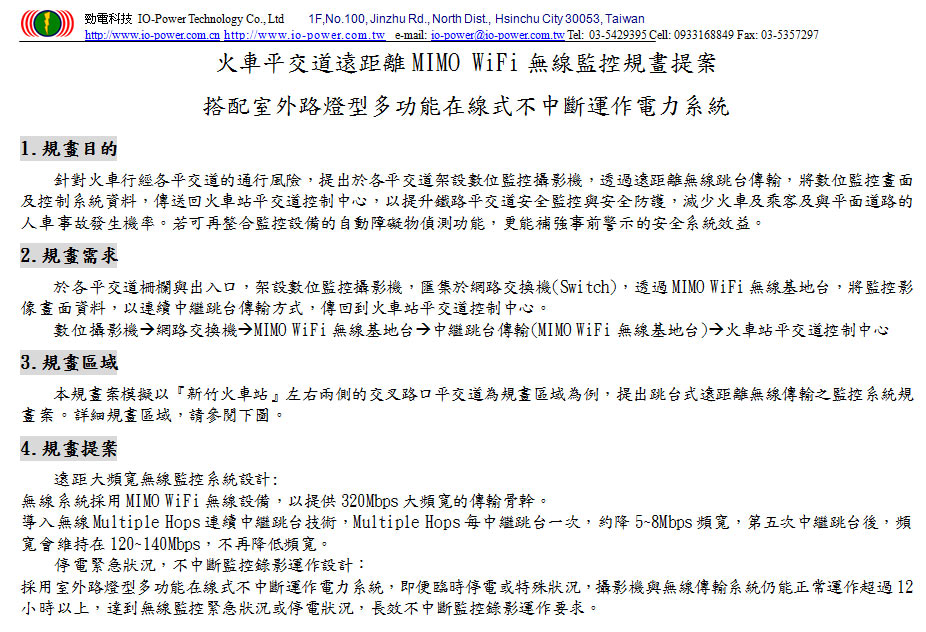 自2009年開始投入室外長效型不斷電電源系統、室外路燈型不斷電電源系統、室外多功能路燈型不斷電電源系統、室外太陽能路燈型不斷電電源系統、室外太陽能多功能路燈型不斷電電源系統…等系統的研發,並取得國內外多項專利。